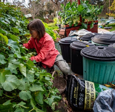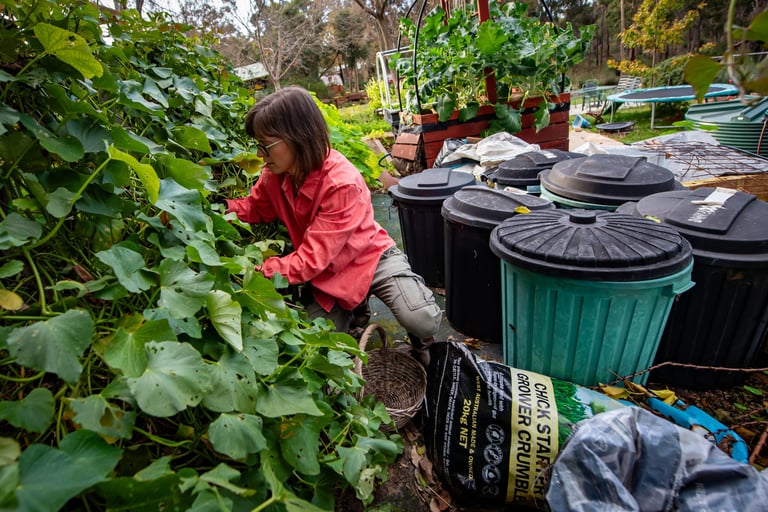 Gathering the materials can occur slowly – you can see my collecting bins in the photo below. But the build needs to occur quickly – I put it all together in one day to a volume of at least 1m by 1m by 1m. This reduces by more than half as it composts.